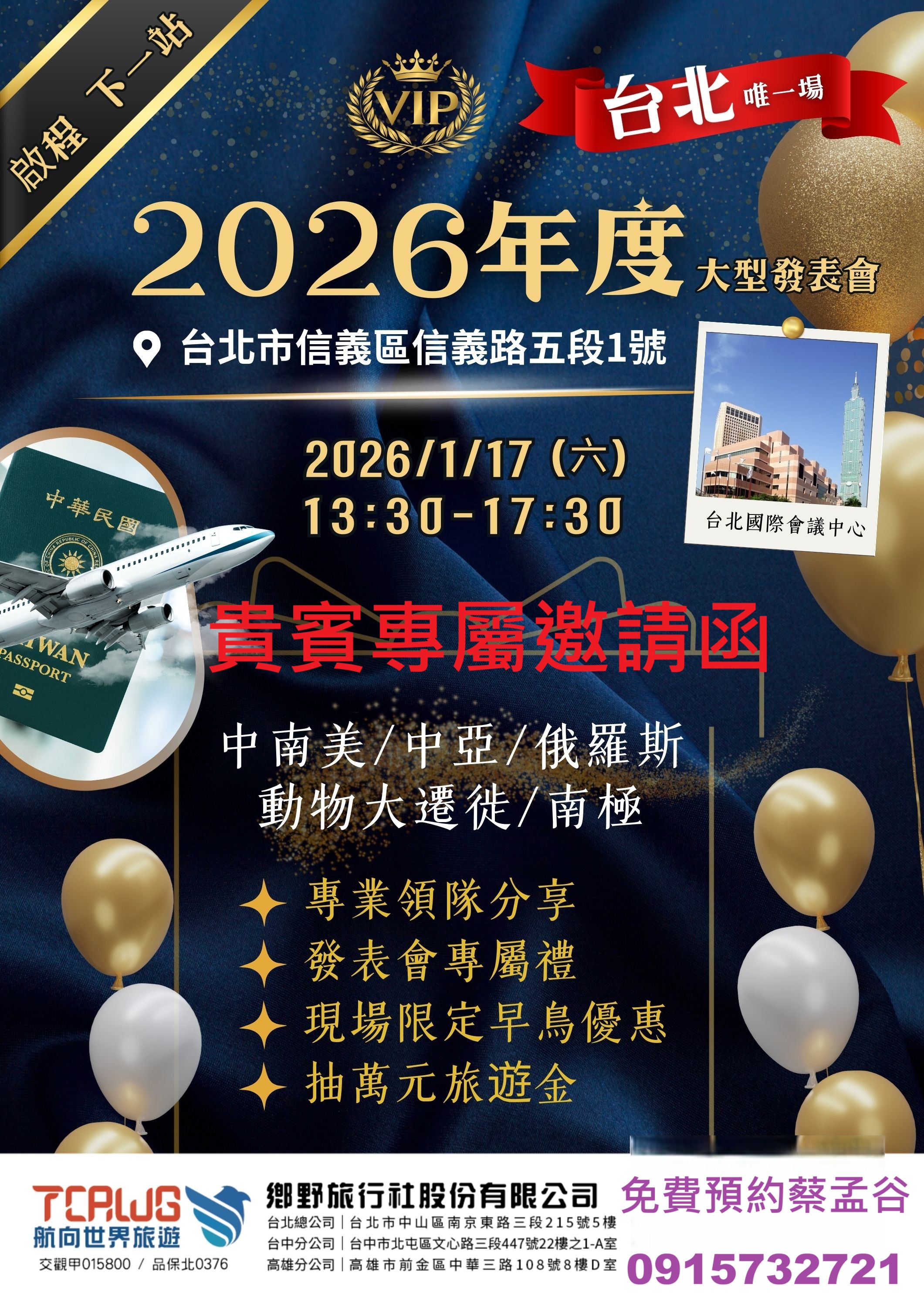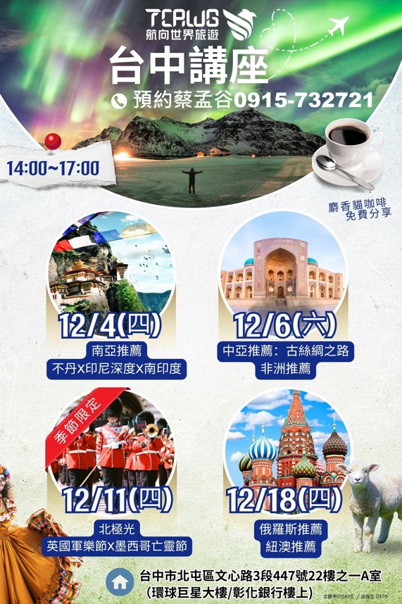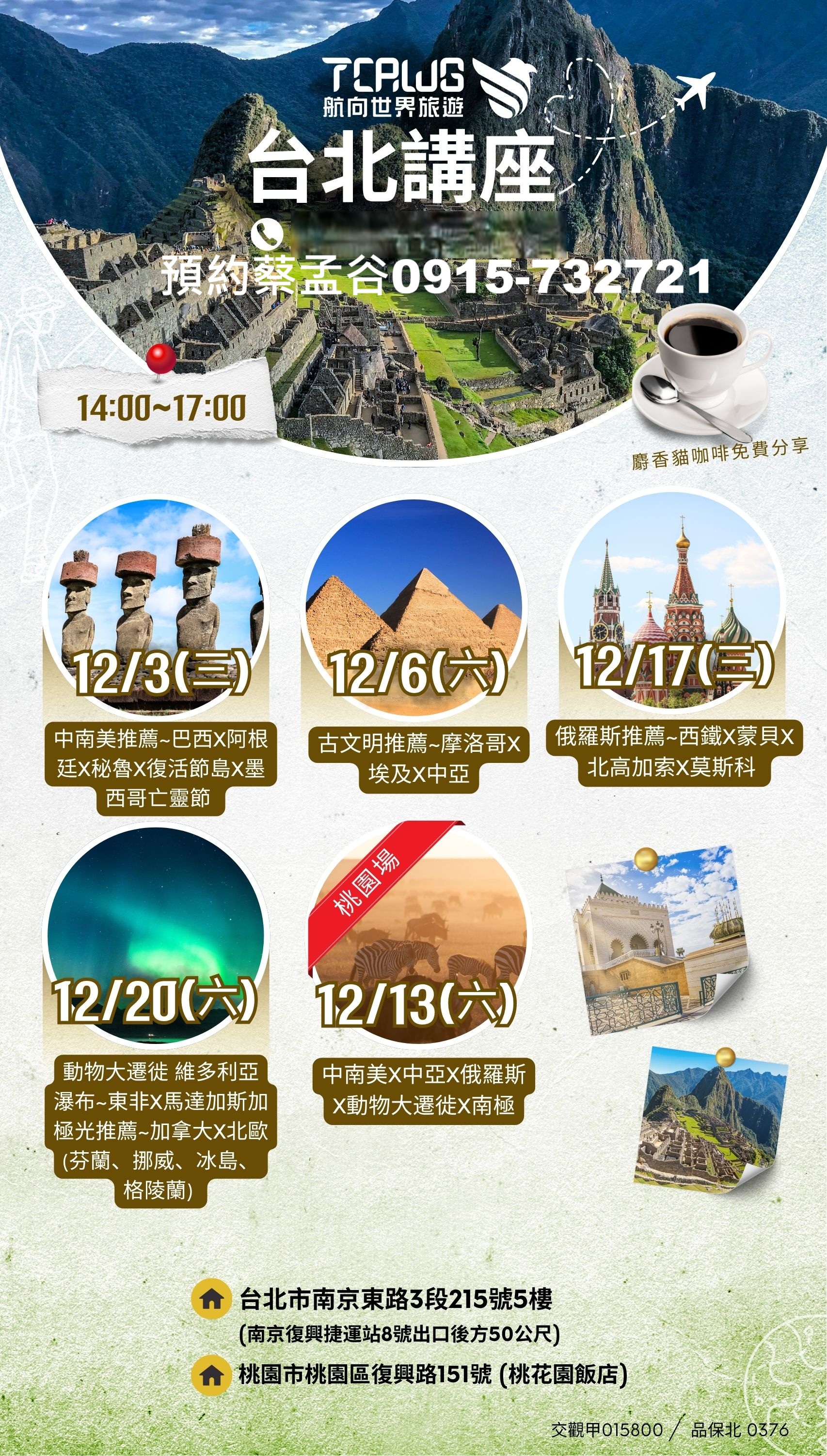 用雙腳走進地球最神祕的角落——從摩洛哥老城、肯亞草原,到北極極光與南半球星海,每段旅程都是一部活生生的紀錄片,而你,就是主角。 由旅遊顧問蔡孟谷親自分享最新旅訊、私房路線與深度玩法,帶你看見「別人不知道的世界」。 現場加碼贈送麝香貓咖啡+百國旅遊手冊 一杯入口瞬間穿越東南亞,一本在手讓世界地圖為你打開。 全台免費講座|台北・桃園・新竹・台中・台南・高雄皆可預約
